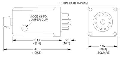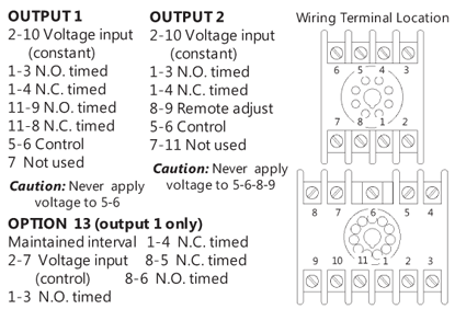 Voltage Present at Control Terminals: 70VDC (120VAC/DC – Types 2 and 4), 30VDC (24VAC – Types 2 and 4), 24VDC (24VDC – Types 2 and 4) Same as input voltage (Type 5) Shipped as an off delay. Remove jumper clip (see dimensions) to convert to pulsed interval