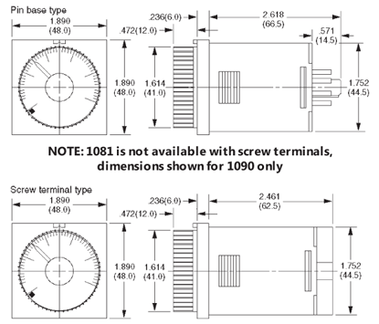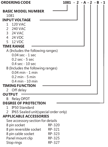 The Kanson 1081 delay timer is a true off delay, with an auto-calibrating dial, wide range of operating voltage options and an LED power indicator. Removal of input power actuates timing sequence eliminating the need for a separate control circuit. Two timing range options provide operation from 0.04 seconds to 10 minutes. Auto-calibrating dial provides a direct reading of time setting in every range. A wide range of operating voltage options support operation from 12VDC to 240VAC, an LED indicates power is applied.