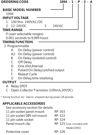 1094 features a large, easy to read, LCD display with programmable time ranges from 0.001 seconds to 9999 hours in 7 programmable timing functions. Two power supply options are available, a wide range of 24 to 240 VAC/DC and a 12VDC only version. A battery back-up maintains memory for up to 7 years. The output is an SPDT relay or open collector transistor.