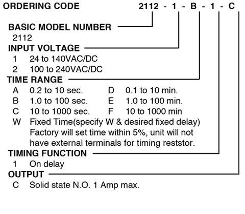 The 2112 features simple two-wire installation. The compact encapsulated timer is adjustable from 0.2 seconds to 1000 minutes in six ranges. Two power supply ranges cover operating voltages from 24 to 240 VAC/DC with a reliable, 1 Amp solid state output.