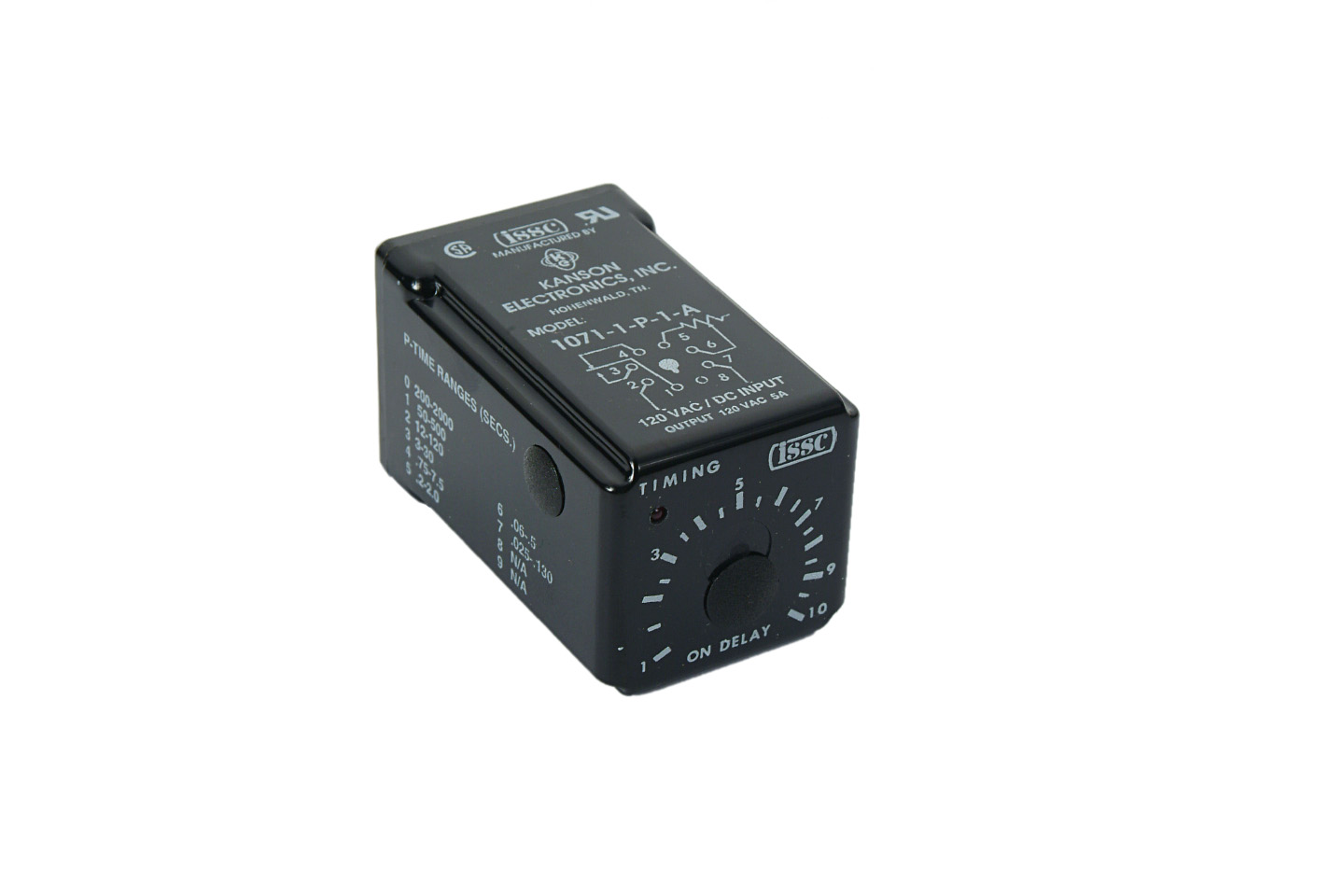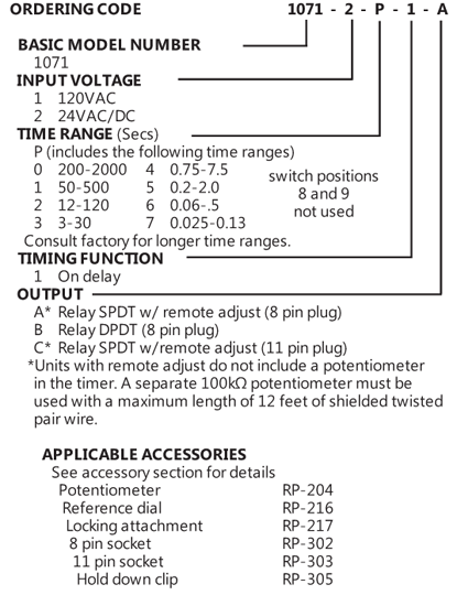 Multi-Range unit is programmable for 8 different time ranges. The 1071 reduces inventory requirements by offering the time range capacity of eight separate timers in one unit. Input Power Actuates timing sequence, eliminating the need for a separate control circuit. Removing power automatically resets timing sequence. Input Is Compatible with both standard mechanical switches and solid state proximity sensors.